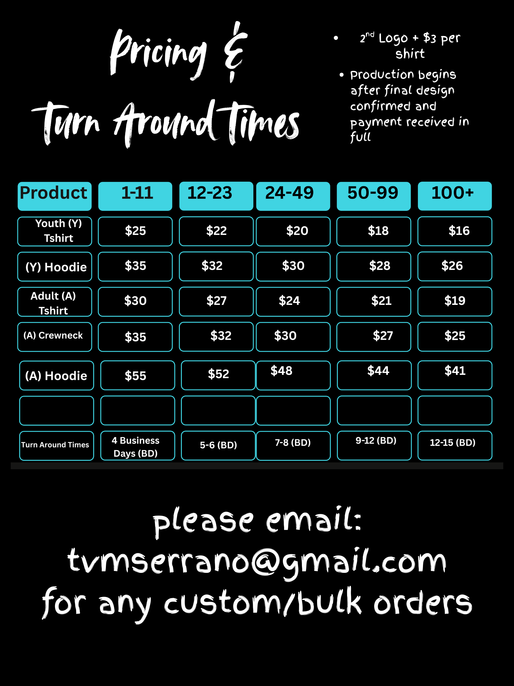 Looking for personalized apparel for your special occasion? We create custom and bulk orders perfect for birthdays, family gatherings, school events, business shirts, and more. Each order is tailored to your needs with pricing based on quantity and customization details. Reach out to discuss your vision—we're here to bring your ideas to life and make your event unforgettable.